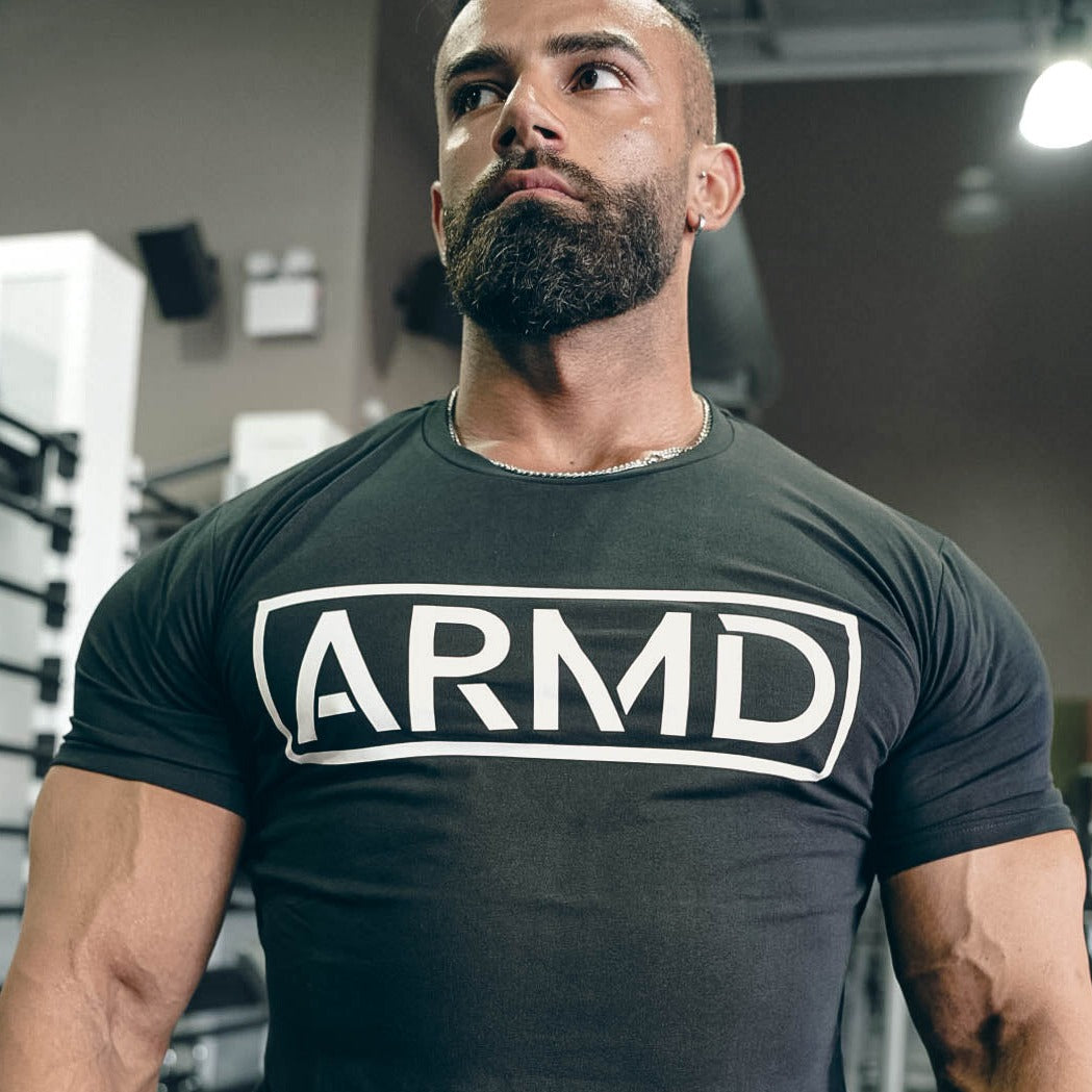 The black color of the t-shirt provides a versatile and classic look that can be easily paired with any outfit, while the white ARMD logo on the chest adds a touch of sophistication and style. The logo is printed using high-quality ink, ensuring that it will not fade or peel over time.