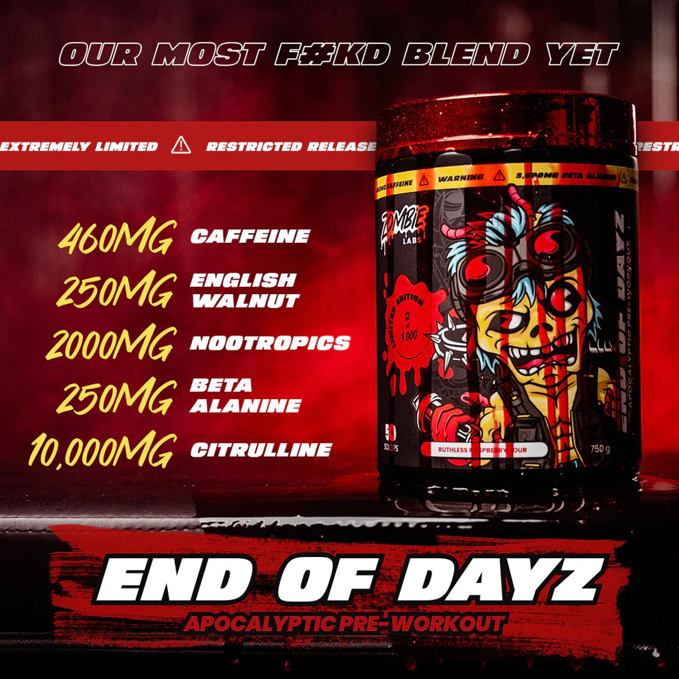 This isn’t just a pre—it’s a reckoning. End Of Dayz takes everything you thought you knew about pre-workouts and flips it on its head. With 460mg caffeine, 10,000mg citrulline, 5,500mg beta-alanine, and a nootropic blend that’ll blow your mind, this is power in its rawest, most untamed form.