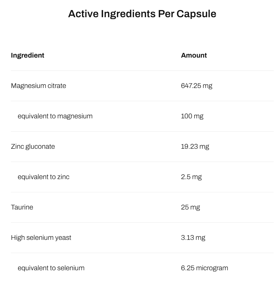 - Magnesium citrate 647.25mg supplying 100mg of elemental Magnesium.