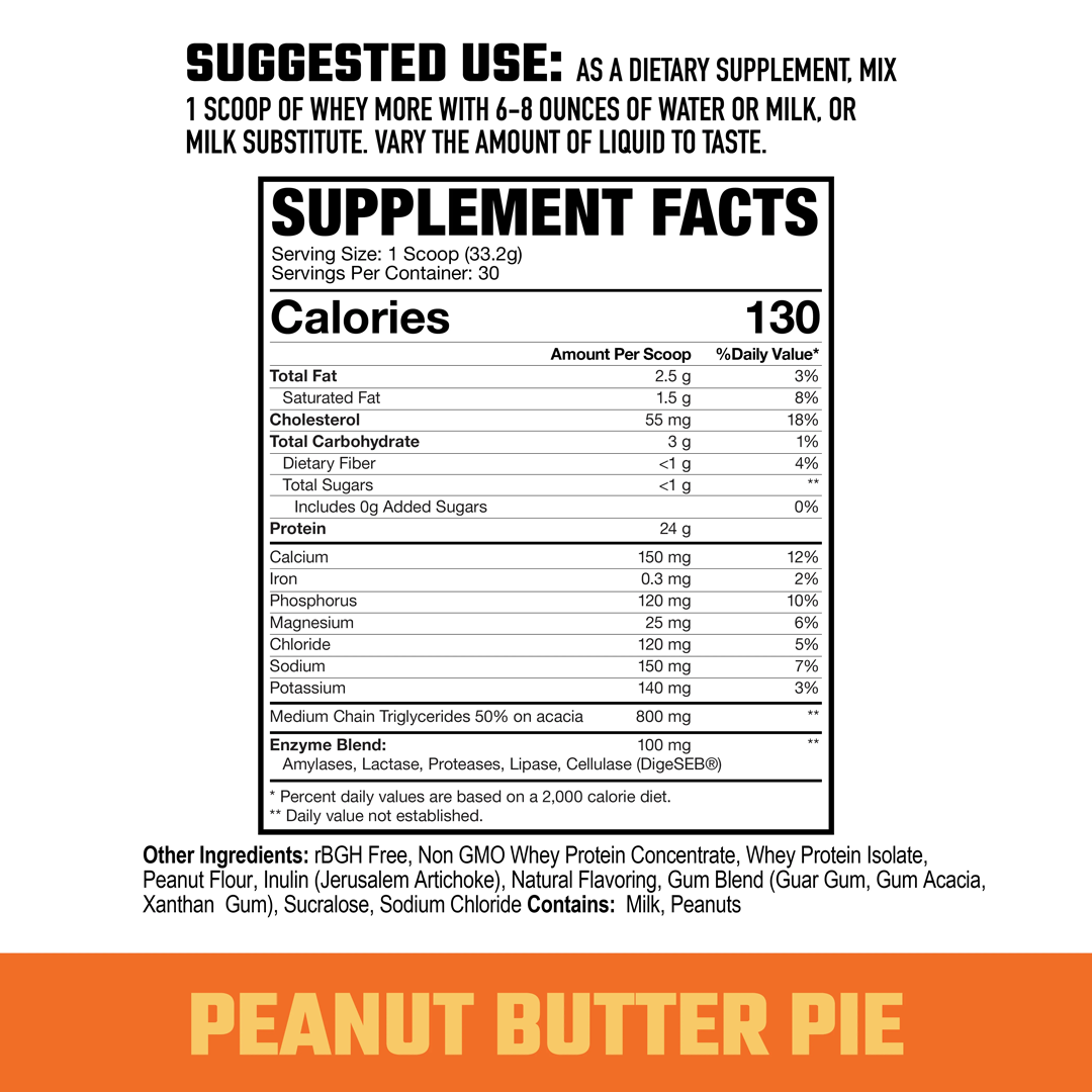 Whey More also features MCTs, prebiotic fiber, and 100 milligrams of Digeseb® to promote nutrient absorption and digestion. †With incredible original flavors, such as Grizzly Honey Graham and Brownie Batter Delight, we're confident you're going to love Whey More!