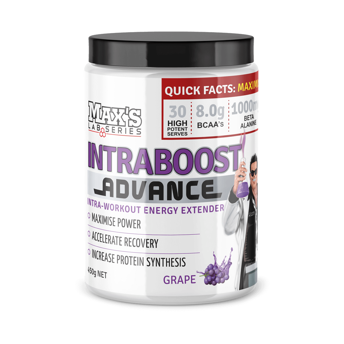 MAX’S IntraBoost Advance is a new and improved Intra-workout formula designed to maximise your training intensity to the end of every workout. It is highly concentrated and contains 8 grams of pure pharmaceutical grade BCAA’S in a 2:1:1 ratio. Based on current Sports Medicine Research this ratio will give enhanced training performance, muscle recovery and protein synthesis. Sip on MAX’S IntraBoost Advance while you train and experience the difference our formula can make.