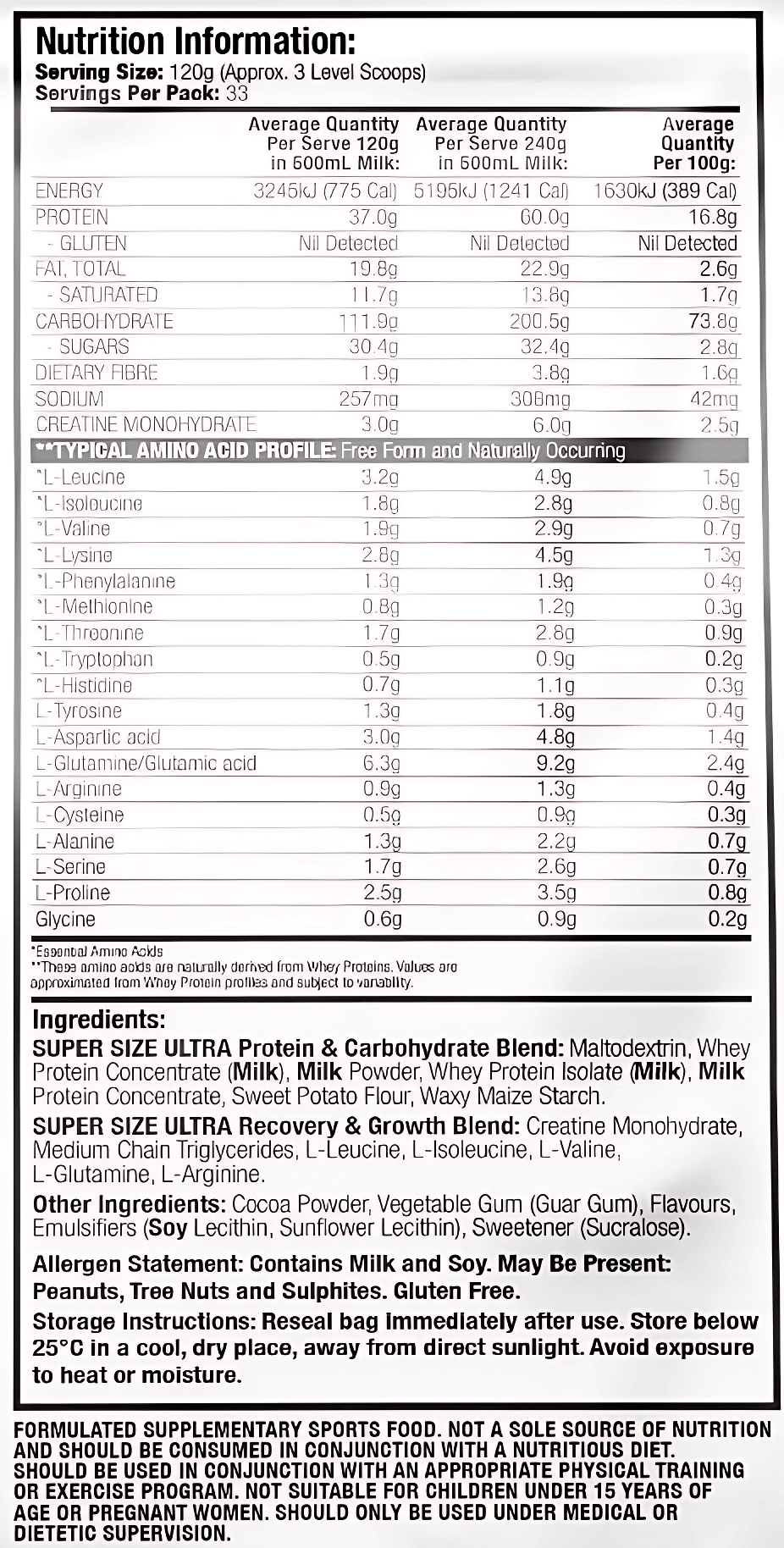 The legendary mass gainer trusted by lifters who want to stack on serious size, fast! Packed with essential calories, quality proteins, 6.0g of pure creatine, and mass-building nutrients, it’s engineered to drive rapid weight and mass gains while fueling harder training and faster recovery. Whether you’re a hard gainer struggling to add size or an athlete chasing next-level growth, SUPER SIZE ULTRA lets you scale your serving to match your goals – from steady gains to massive bulk. When it comes to building serious size, this formula needs no introduction.