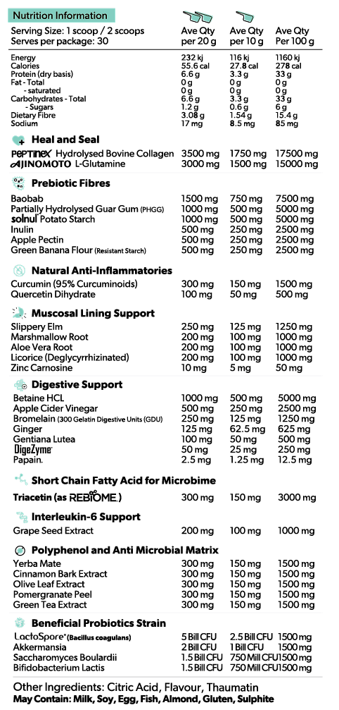 Peptinex Hydrolysed Type I & III Grass Fed and Grass Finished Collagen, and Ajinomoto Japanese fermented L-Glutamine fuel and maintain intestinal wall structure, while Zinc Carnosine supports tissue protection — helping your gut feel resilient and restored.