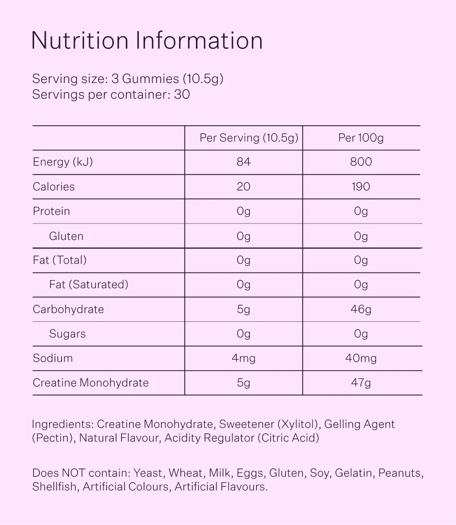 Sugar free, gluten free and vegan. Each bag contains 90 gummies, which is a one month supply of 5g of creatine per day.