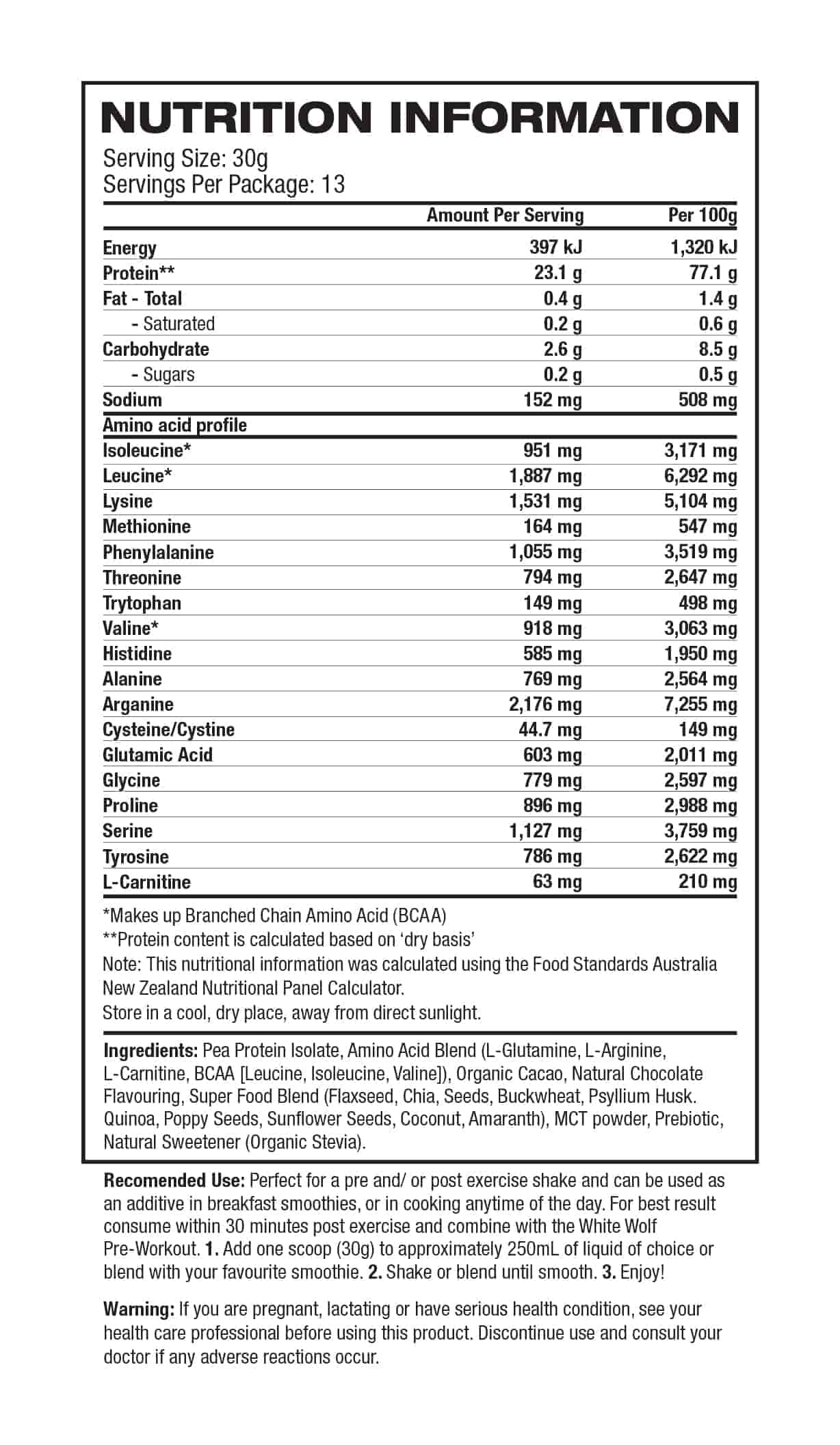 White Wolf Nutrition's Vegan All-In-One protein is a smooth and creamy, naturally complete, quick releasing protein made from non-GMO, superior Belgian golden-yellow peas, extracted through a natural process to ensure maximum bio-availability. It is naturally sweetened using organic stevia sourced locally from Australian farms and is flavoured with a natural, creamy, delicate cacao. This unique formula consists of superfoods, Medium-Chain-Triglycerides (MCT) and a prebiotic which can assist in digestion, reducing stored body fat and increasing energy levels. We have also added an array of essential and non-essential amino acids to help with the repair, growth and maintenance of healthy cells. Our Vegan protein has been scientifically formulated to provide key nutrients that are essential for people who follow a vegan diet.