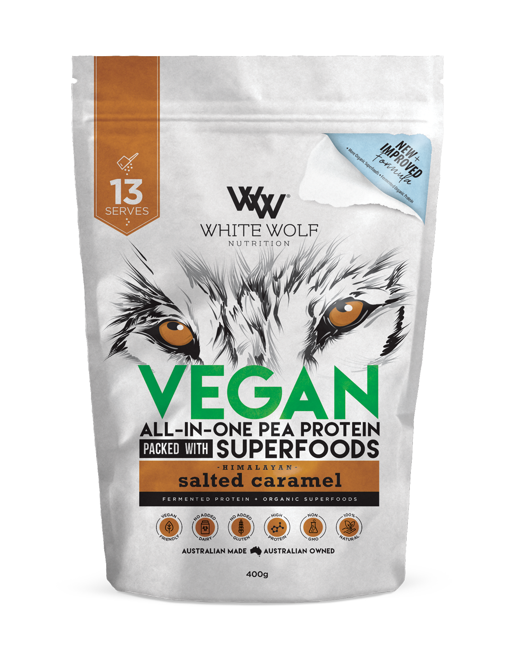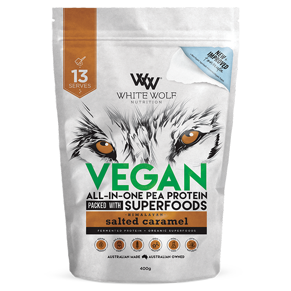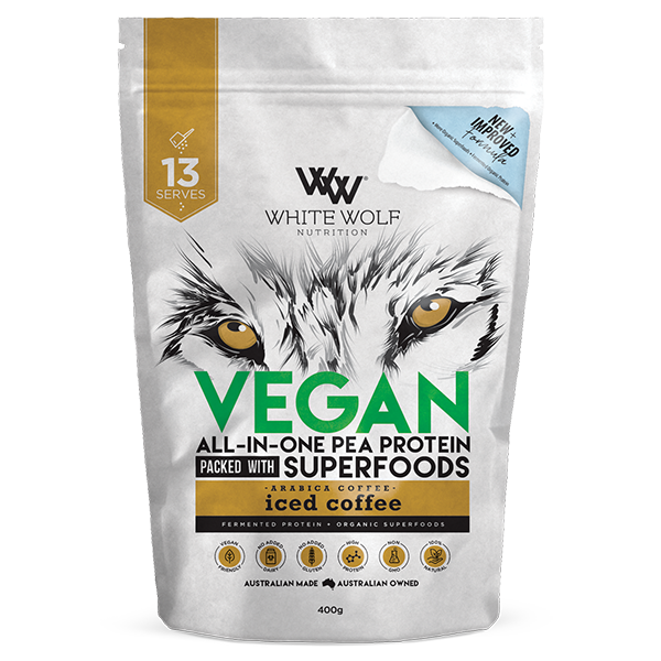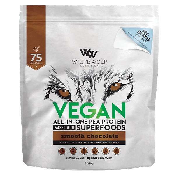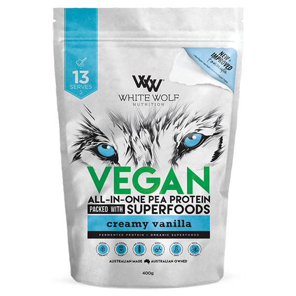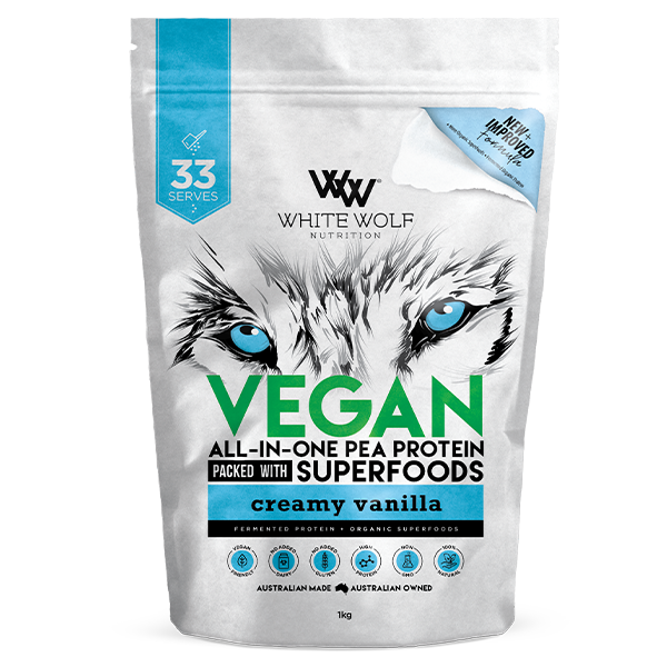 White Wolf Nutrition's Vegan All-In-One protein is a smooth and creamy, naturally complete, quick releasing protein made from non-GMO, superior Belgian golden-yellow peas, extracted through a natural process to ensure maximum bio-availability. It is naturally sweetened using organic stevia sourced locally from Australian farms and is flavoured with a natural, creamy, delicate cacao. This unique formula consists of superfoods, Medium-Chain-Triglycerides (MCT) and a prebiotic which can assist in digestion, reducing stored body fat and increasing energy levels. We have also added an array of essential and non-essential amino acids to help with the repair, growth and maintenance of healthy cells. Our Vegan protein has been scientifically formulated to provide key nutrients that are essential for people who follow a vegan diet.