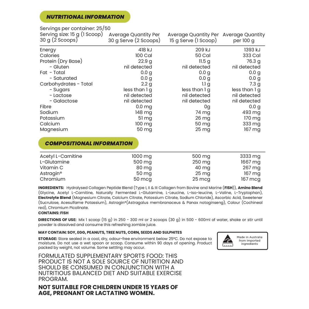 Mix 1 scoop (15 g) in 250-300 ml or 2 scoops (30 g) in 500-600ml of water, shake or stir until powder is dissolved and consume this refreshing zombie juice.